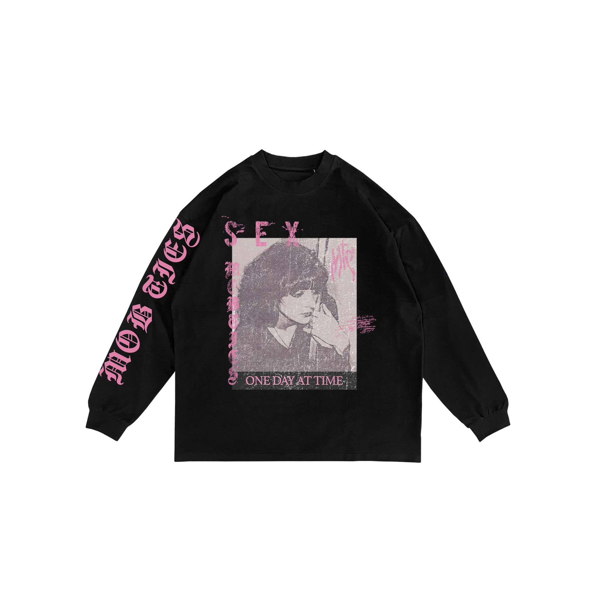 Bold, raw, and nostalgic. This white long-sleeve features a distressed front graphic layered with striking pink text and sleeve lettering. A mix of retro zine energy and modern streetwear attitude, finished with the phrase “ONE DAY AT TIME:” for a reflective edge. A statement piece for anyone who likes their style loud and unapologetic.